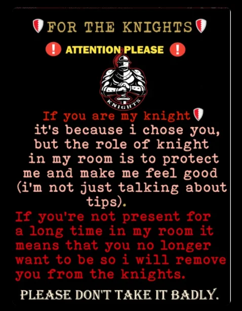 Tip 1 752+ tokens in my room to be knighted , this is permant unless u are away from my room longer than 7 days 💕